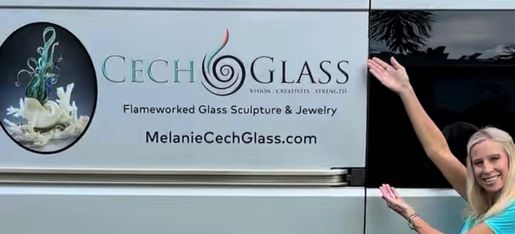 My flamework glass sculptures and jewelry are made with borosilicate glass rods. The pieces are sculpted in an oxygen/propane flame, trimmed with 22kt gold. All pieces are unique, one-of-a-kind designs, with many set in natural corals, shells, and stones that represent my love for sun, sand, and sea.