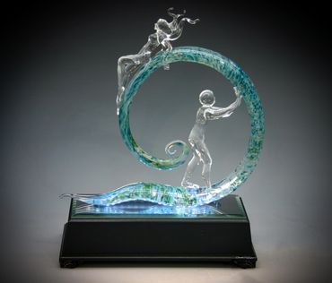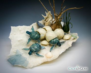 My flamework glass sculptures and jewelry are made with borosilicate glass rods. The pieces are sculpted in an oxygen/propane flame, trimmed with 22kt gold, an. All pieces are unique, one-of-a-kind designs that are set in natural corals, shells, and stones that represent my love for sun, sand, and sea.